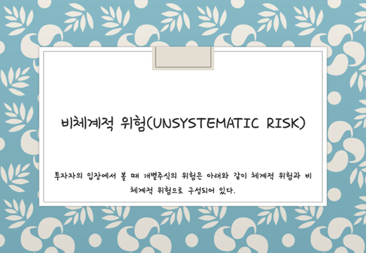 증권시장 전반의 움직임에 관계 없이 특정 개별주식에 한정된 위험으로 잔차위험이라고도 한다.