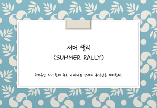 주식시장에서는 매년 초여름인 6월에서 7월까지 한 차례 주가가 크게 상승하는 경향이 있는데 이를 여름철 반등장, 즉 summer rally'라고 부른다.