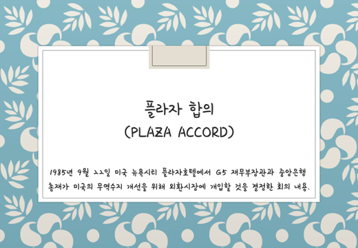 1985년 9월22일 프랑스와 독일, 일본, 미국, 영국 등 선진 5개국 중앙은행 총재가 미국의 무역수지 개선을 위해 일본 엔화와 독일 마르크화의 평가절상을 유도하며 이것이 순조롭지 못할 때에는 정부의 협조 개입을 통해 목적을 달성한다는 등의 내용에 합의한 것이 뉴욕의 플라자 호텔에서 논의되었다고 해서 플라자 합의라고 불립니다.