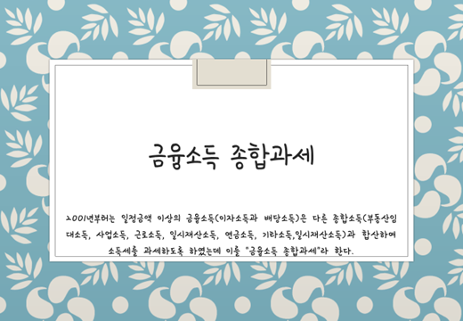 종전에는 금융기관 등에서 이자를 지급할 때 세금을 떼서 납부하면 그 이자소득에 대하여는 세금문제가 모두 종결되므로, 이자를 받는 사람 입장에서는 세금에 대하여 신경을 쓸 필요가 없었다. 그런데, 2001년부터는 일정금액 이상의 금융소득(이자소득과 배당소득)은 다른 종합소득(부동산임대소득, 사업소득, 근로소득, 일시재산소득, 연금소득, 기타소득,일시재산소득)과 합산하여 소득세를 과세하도록 하였는데 이를 “금융소득 종합과세”라 한다.