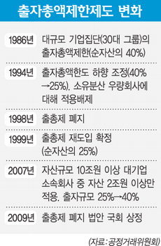 출자총액제한제도는 1987년 4월부터 도입·시행되어 오다 1997년말 외환위기 이후 외국인 투자자유화에 따라 외국인들의 국내 기업에 대한 적대적 M&A에 어느 정도 경영 방어권을 보장해 줄 필요가 있다는 판단하에 1998년 2월에 폐지되었다.