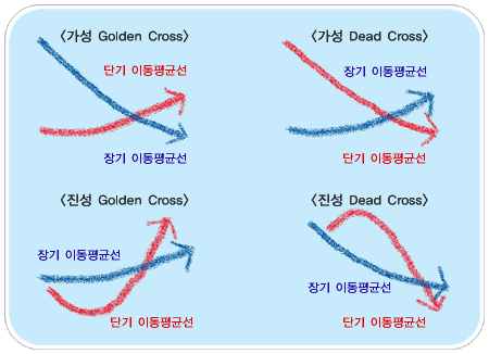 보통 '단기 골든크로스'는 5일 이동평균선이 20일 이동평균선을 상향돌파 하는 것을 말하며 '중기 골든크로스'는 20일선과 60일선을, '장기 골든크로스'는 60일선과 100일선을 비교한다.