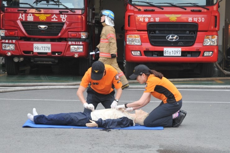 ① 재해자의 입으로부터 오물, 이물질 등을 제거하고 평평한 바닥에 반듯하게 눕힘