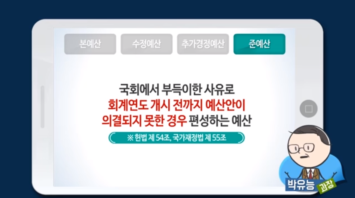 예산 원칙에 입각하여 국회는 회계연도 개시 30일 전까지 정부가 제출한 예산안을 심의 확정하여야 한다. 그러나 부득이한 사유로 인하여 회계연도 개시 전까지 국회에서 예산안이 의결되지 못한 경우에는 에산이 성립될 때까지 공무원의 봉급, 기관의 유지비, 경비, 계속비 등을 전년도 예산에 준해서 집행할 수 있도록 헌법과 예산회계법에 예산불성립시 예산집행에 대하여 규정하고 있다.